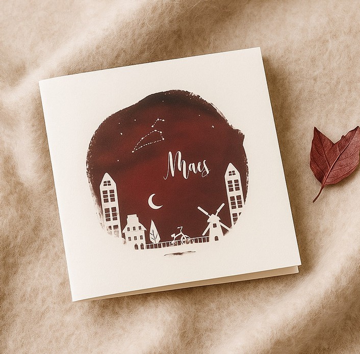 Geboortekaartje met een mini doorkijkje in de "mini magic world" collectie. Kies je eigen "sphere" en maak je eigen verhaaltje met de illustraties uit de beeldbank. Deze kaart heeft een leuk hollands tafereeltje, met stadse elementen.