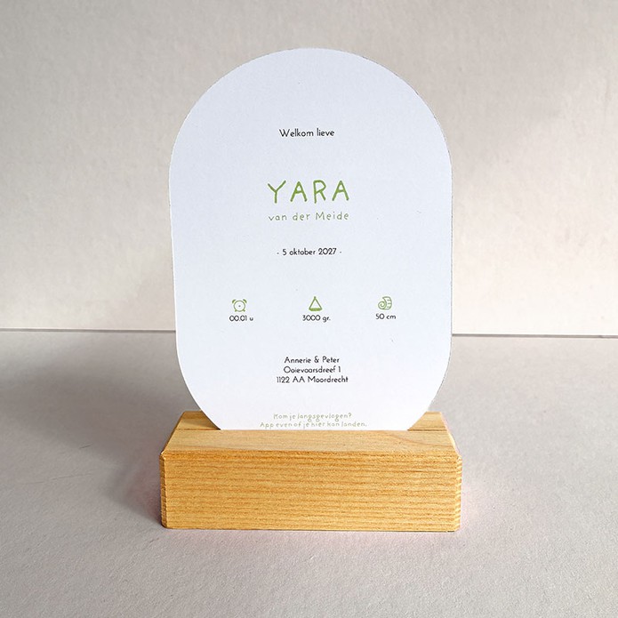 Verras familie en vrienden met dit unieke geboortekaartje in ovale vorm – nét even anders en extra bijzonder. De lieflijke illustratie van een ooievaar in een luchtballon geeft het kaartje een dromerige en avontuurlijke uitstraling. Perfect voor ouders die op een speelse en originele manier het grote nieuws willen delen.