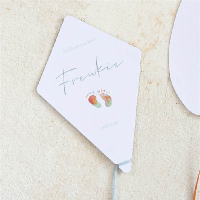 Vrolijk geboortekaartje in de vorm van een vlieger. Met de kleurtjes en gekleurde voetjes extra speciaal voor een regenboogbaby. Pas het kaartje helemaal naar eigen wens aan. Aan de onderkant van de vlieger kan je zelf een lint of slinger vastmaken. Leuk met strikjes of om bijvoorbeeld een klein kaartje aan bij te voegen met de uitnodiging voor een babyborrel.