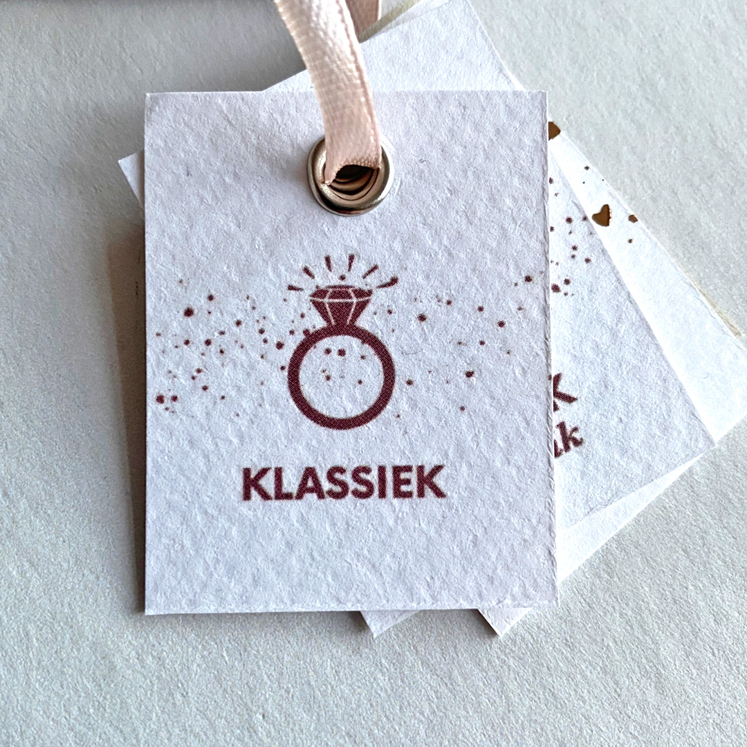 Voor trouwkaarten wordt over het algemeen vaak gekozen voor klassiek papier. Het is een papiersoort met klein wolkerige structuur en het is iets off-white als je het naast mat wit papier legt. De meeste trouwkaarten die nu voorbijkomen zijn vrij minimalistisch qua illustraties, waardoor er meer van het materiaal zichtbaar is. Daarom is het klassieke papier echt een mooie optie voor jullie trouwkaarten. Verder geldt eigen hetzelfde als voor de geboortekaartjes. Heb je illustraties/foto's met kleine fellere kleuren dan zou ik een mat wit papier aanraden en zachte/sfeervolle kleuren komen mooi uit op zijdeglans papier. Is jouw ontwerp bedoeld voor een menukaart? Kies dan voor een enkele kaart van Zijdeglans Extra dik papier; dit kan tegen een stootje en een drup.