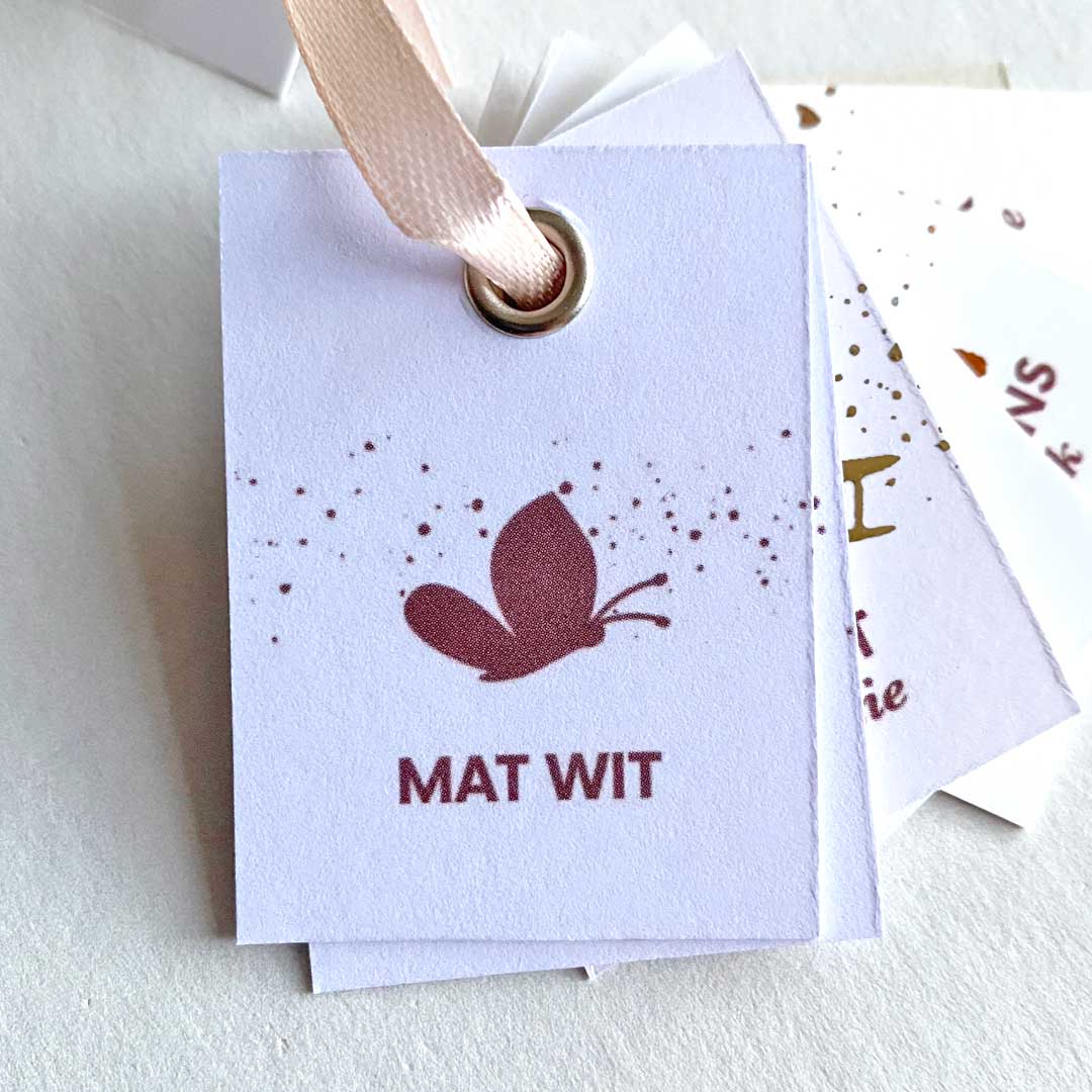 Voor trouwkaarten wordt over het algemeen vaak gekozen voor klassiek papier. Het is een papiersoort met klein wolkerige structuur en het is iets off-white als je het naast mat wit papier legt. De meeste trouwkaarten die nu voorbijkomen zijn vrij minimalistisch qua illustraties, waardoor er meer van het materiaal zichtbaar is. Daarom is het klassieke papier echt een mooie optie voor jullie trouwkaarten. Verder geldt eigen hetzelfde als voor de geboortekaartjes. Heb je illustraties/foto's met kleine fellere kleuren dan zou ik een mat wit papier aanraden en zachte/sfeervolle kleuren komen mooi uit op zijdeglans papier. Is jouw ontwerp bedoeld voor een menukaart? Kies dan voor een enkele kaart van Zijdeglans Extra dik papier; dit kan tegen een stootje en een drup.